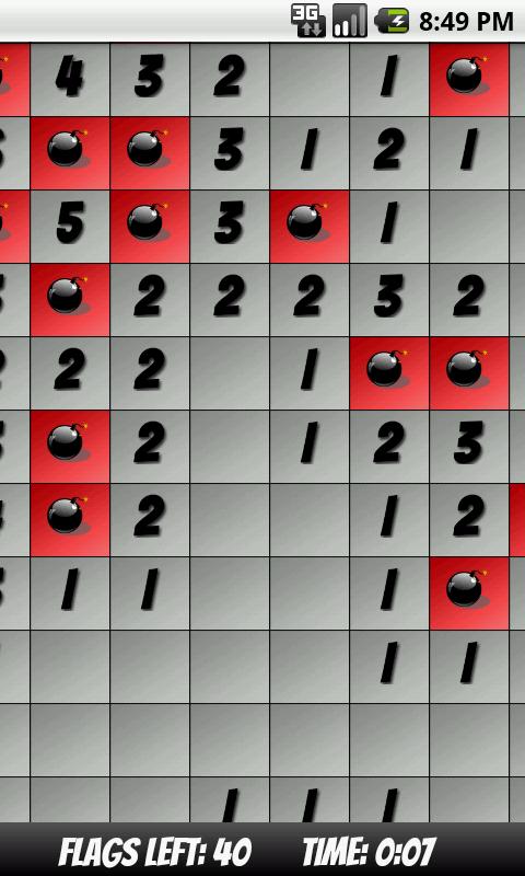 Inspired by the classic game Minesweeper, the game challenges you to clear a bomb-laden field strategically using numbers that represent the number of nearby mines. Do a "long click" to set a flag to mark suspected mines. Includes difficulty setttings, including both "Small" (phone screen-optimized) levels and "Large" ones (require scrolling on non-tablets).