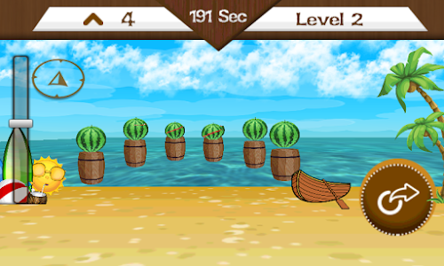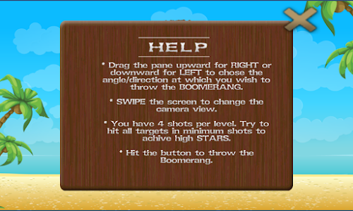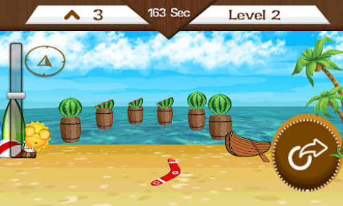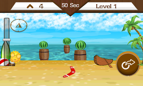 Probably the first ever realistic kind of boomerang shooting game. In the first version we have just launched 7 levels having water melons as your targets to cut with your Boomerang. There is a scrolling angle pane given on the left hand side where you can set your boomerang's throwing angle and then you can also change your camera view by swiping left, right or upwards and see if you have set your pane to the perfect position.