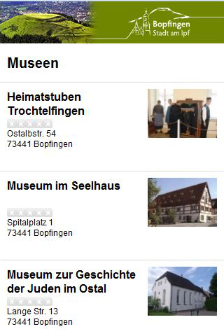 JETZT kostenlos DOWNLOADEN!By CITYGUIDE Bopfingen You have the whole city digitally for your pocket and all the important information around the clock always ready to hand. By CITYGUIDE inform yourself about events, top venues, industries and local businesses. Go to the 360 ° Panorama function on a virtual city walk to the shops into it, you can be opening times, services and brands show. Find with the Search & Around Me function, the nearest restaurant, the next florist, baker or fashion store and take advantage of special promotions (deals & coupons) in CITYGUIDE Bopfingen.