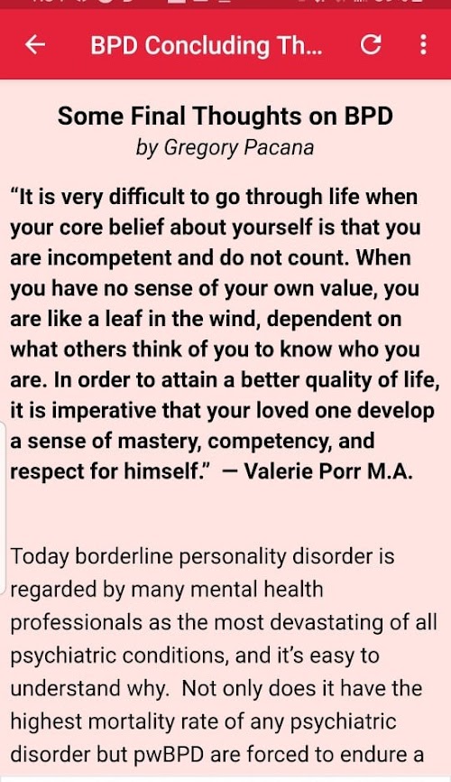 This app will explore borderline personality disorder including the origin of the disorder, the symptoms, and associated behaviors, the statistics associated with BPD, and the current treatments. Despite what was once believed about BPD being untreatable, we now know that with the proper psychotherapy many people with BPD do get better and even fully recover.