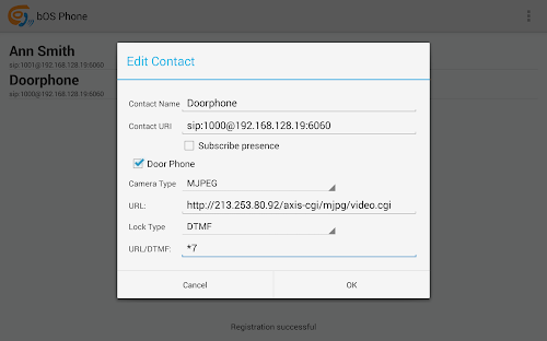 - The "Contact URI" should be set to the address of the door phone (e.g. sip:[email protected], where 100 is SIP username of the door phone and 10.10.2.1 is the address of the registrar).