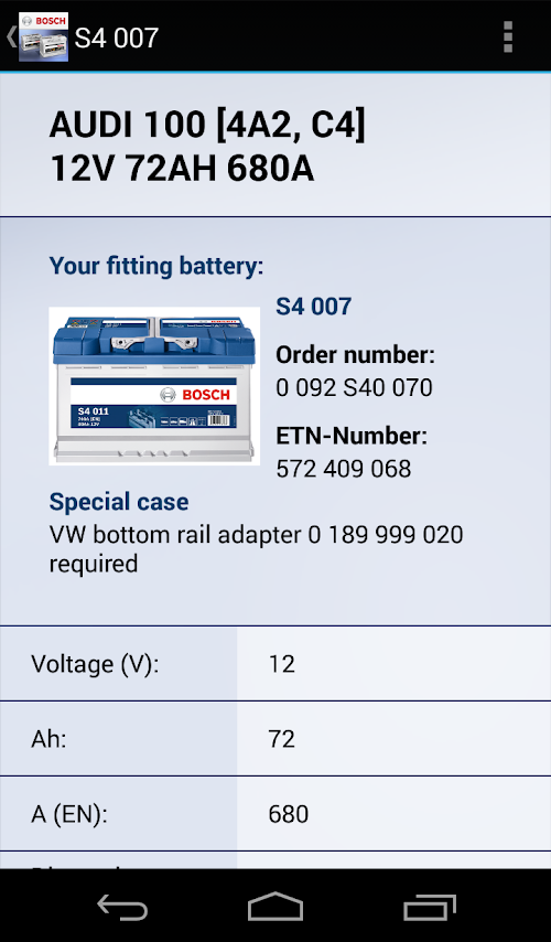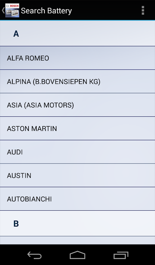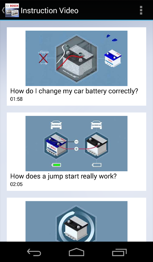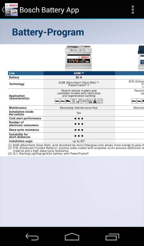 The Bosch battery app supports end users in finding the right Bosch battery for his car. After entering the relevant vehicle data a selection of batteries is displayed, its properties are described. After deciding on a battery short search number for locating the battery on the shelf is displayed. In addition, the app users will give a summary of the main features of the Bosch batteries.