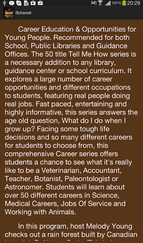In this app, host Melody Young checks out a rain forest built by Canadian botanist, Dr. Nancy Greig. This indoor, climate controlled rain forest is home to over 3,000 butterflies. Watch as Dr. Nancy Grieg works in the butterfly museum. This program reviews the relationship between plants and insects, butterflies coming out of a chrysalis to a cocoon, rainforest footage, a pet Iguana and the daily workings of this informative exhibit. Subjects Covered Include: What does a Botanist Do? Why do we want to study plants? What types of plants are in a rainforest? Do I have to go to college to be a Botanist? What is the difference between a butterfly and a moth? How do butterflies eat?