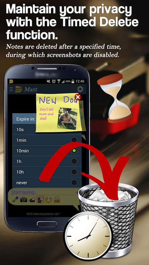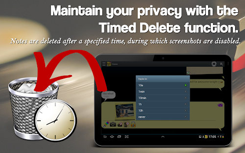 • Keep your privacy! Timed Delete lets you limit the lifetime of your messages, notes and images by setting a deletion time of 10 seconds, 1 minute, 10 minutes, 1 hour or 10 hours. Recipients will also be blocked from taking screen shots of them on their devices.