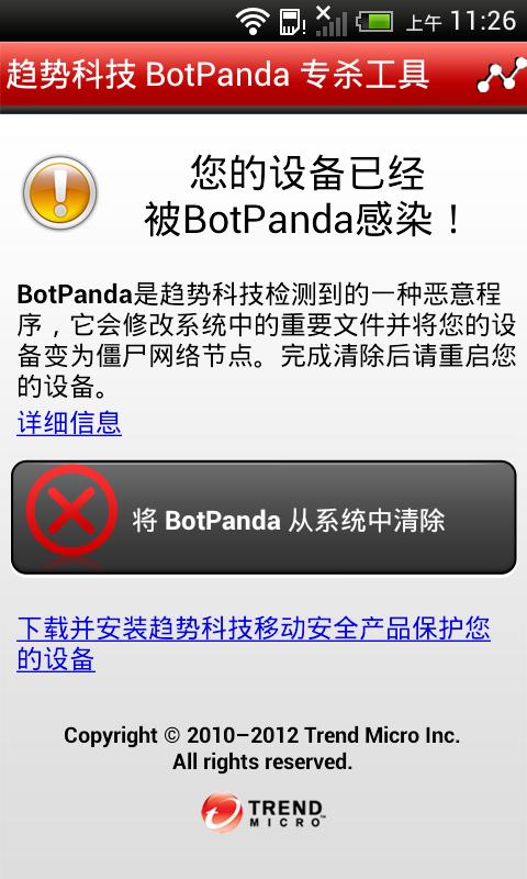 Trend Micro BotPanda Cleaner is a standalone android antivirus tool that scans Android devices to detect infections from the Android virus called BotPanda.A. BotPanda.A is an android virus that infects rooted android devices, it places malicious files onto the device that allow a hacker to take control of the device from anywhere on the internet.