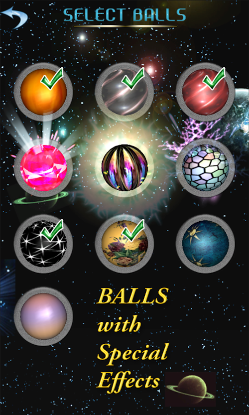 10 custom balls with special effects. Player can select up to 10 balls, each ball for each throw.