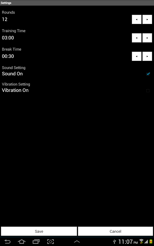 Exercise time is displayed red letters, and break time is green. Between each round, you can set a sound or vibration notification.