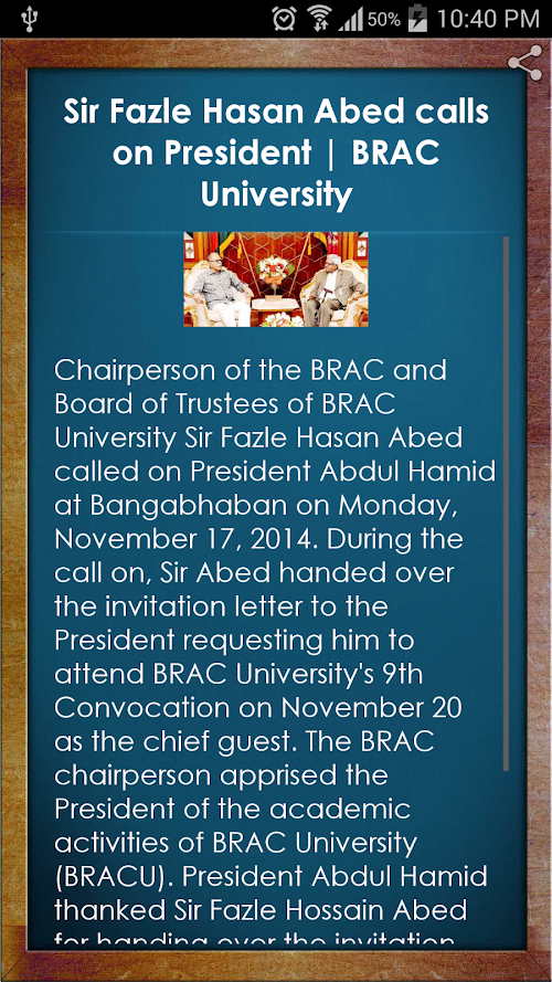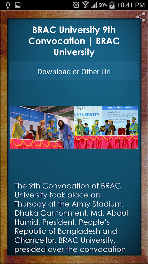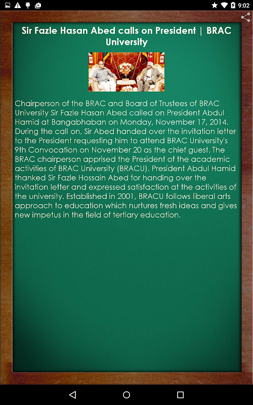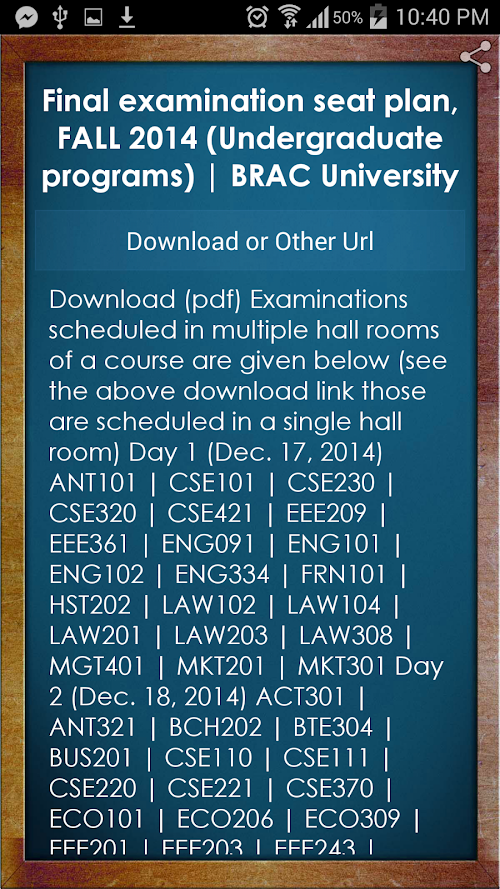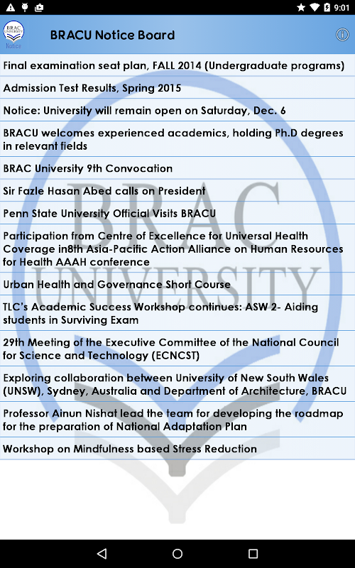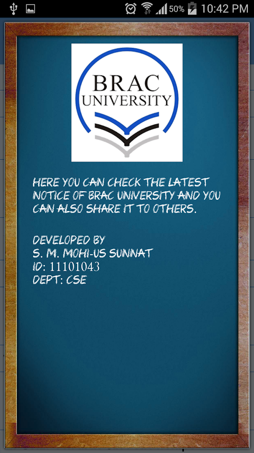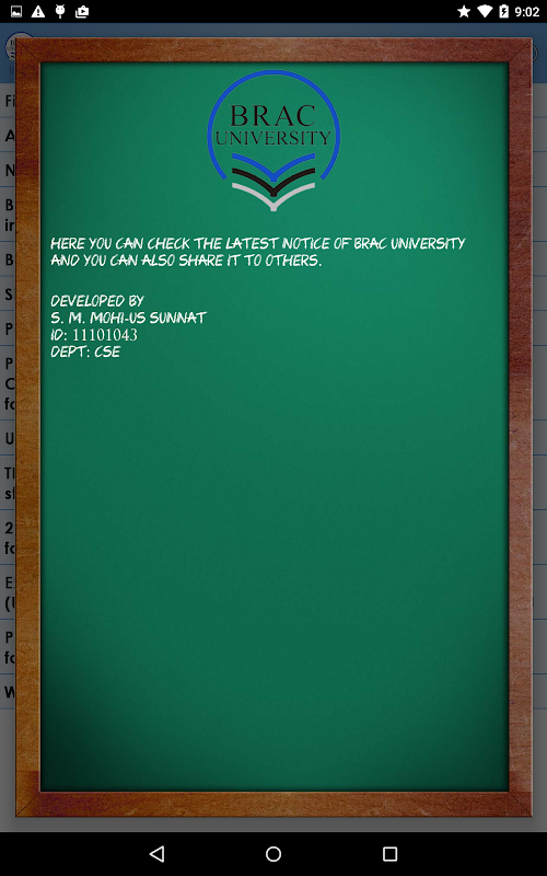 This is an unofficial app of BRAC University. This app shows you the latest notices of BRAC University. You can also share to others via Facebook, Gmail, SMS and other social networks.