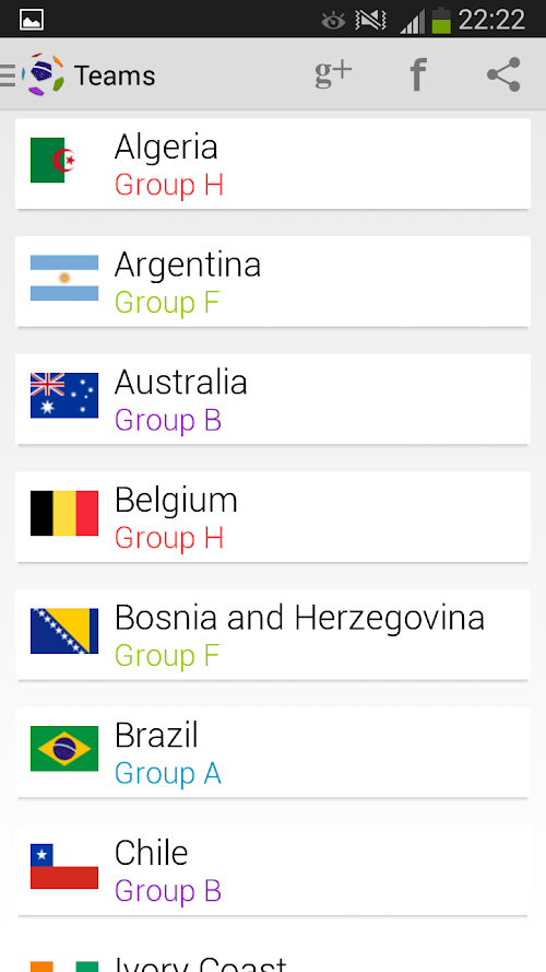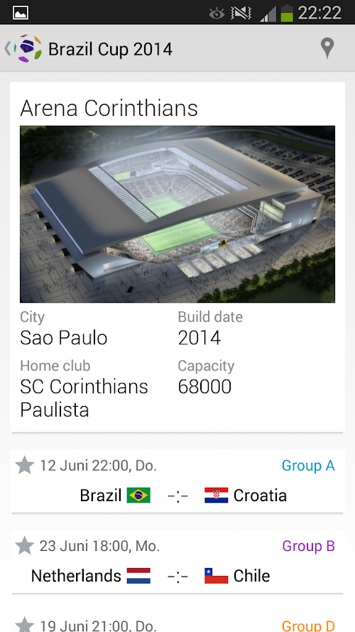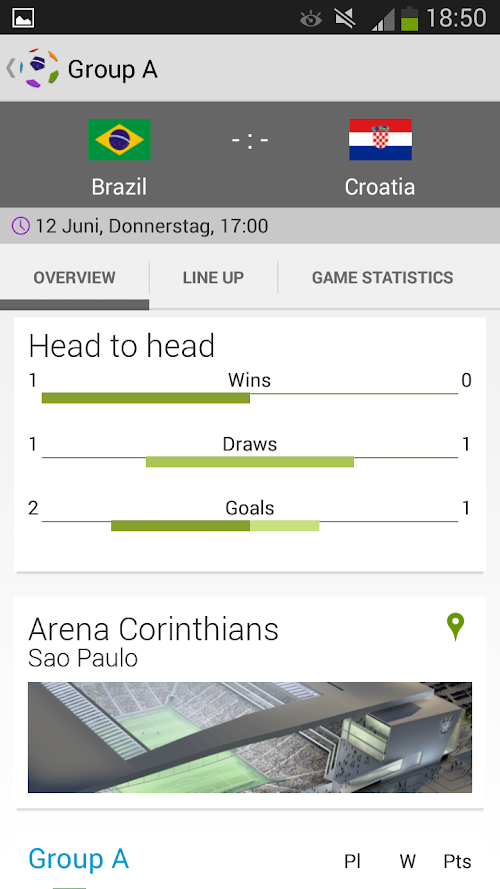 This mobile application keeps you informed about the FIFA Football World Cup 2014, in Brazil. It also provides an insight into the history of the World Cup and offers a detailed overview of the participating football teams and players. Select your favorite games and you will be notified about the start of those matches. With this app, you can receive live results, plus current standings and team-statistics. Even more than that, the app also contains a countdown, schedules and information about the stadiums and their locations.