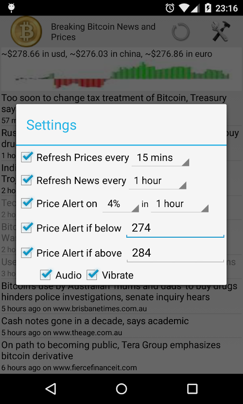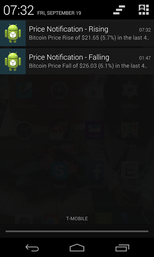From the settings, Price Alerts can be configured. Provide a swing amount, and a duration for the alert. For example, alert on a 10% change in a 4 hour period. A notification will be received on the phone (along with an optional vibrate and sound). Or provide a low and high price for notifications. On crossing that threshold, a notification will be received. Configure notifications also in the settings, to be silent (just a notification), to vibrate, or to make a sound.