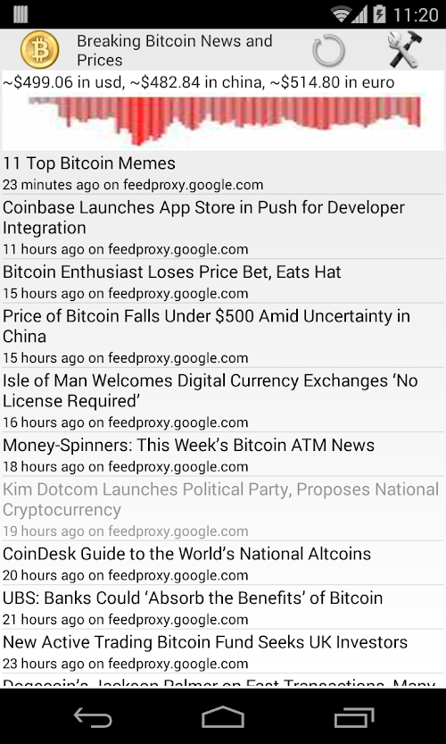 At the top is also the current price. The USD price is also compared with the Yuan price and Euro price converted to USD with the current exchange rates. This shows which regions are moving the price up or down. China often has big spreads from the US and Europe. Also a bar chart indicates the latest 24 hour price trend, with red and green bars. Change the chart period in the settings to show up to 7 days, and view longer trends. The 24 hour trend should roughly correlate with the first page of news stories.