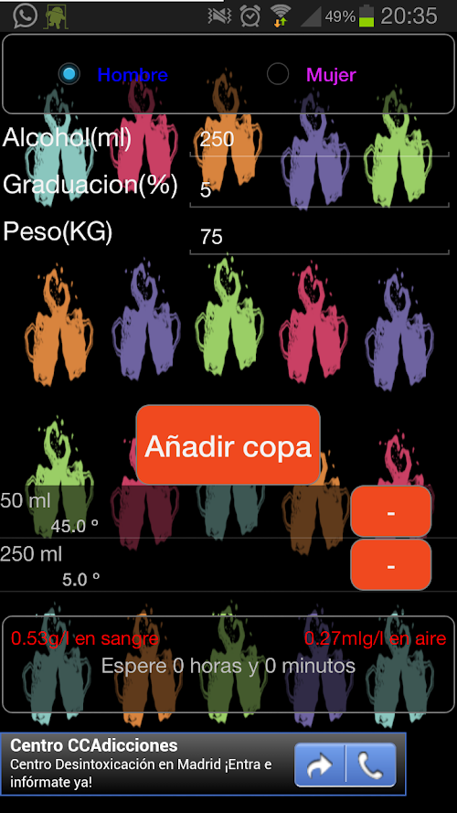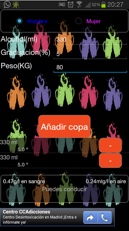 • With the alcohol volume, your weight and the quantity in ml you have drink we will be able to give you the aproximately Blood Alcohol content (BAC).