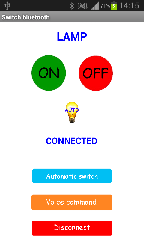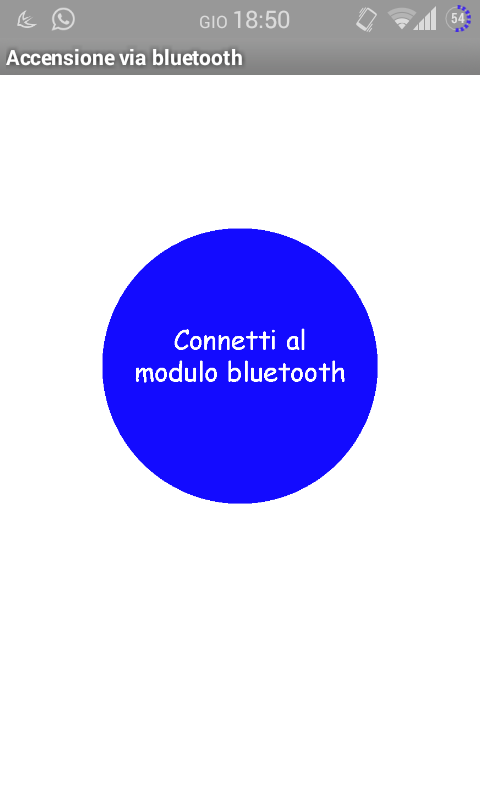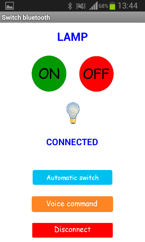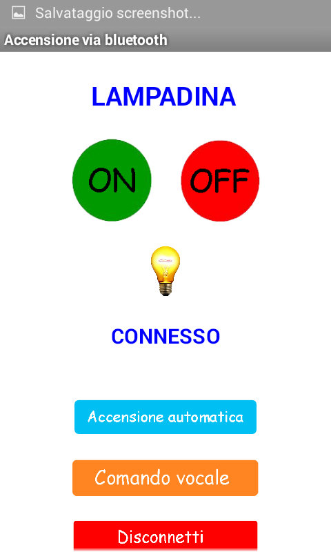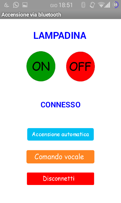 N.B. Prima di aprire l'applicazione assicurati che il telefono sia già associato al modulo bluetooth altrimenti non troverà il dispositivo.This application is designed to interact with a bluetooth module to be connected to the Arduino to turn on at a distance a light bulb or any electronic device such as a stereo, a microwave distance bluetooth.