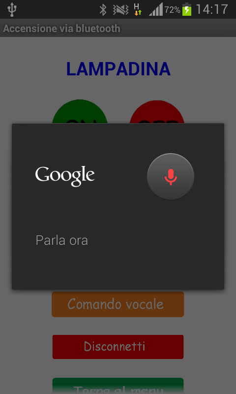 E' possibile, premendo il tasto "comando vocale" o passando la mano vicino al sensore di prossimità del telefono, pronunciare le parole "ON" per accendere la lampadina, "OFF" per spegnerla e "AUTO" per accenderla automaticamente con l'utilizzo della fotoresistenza.