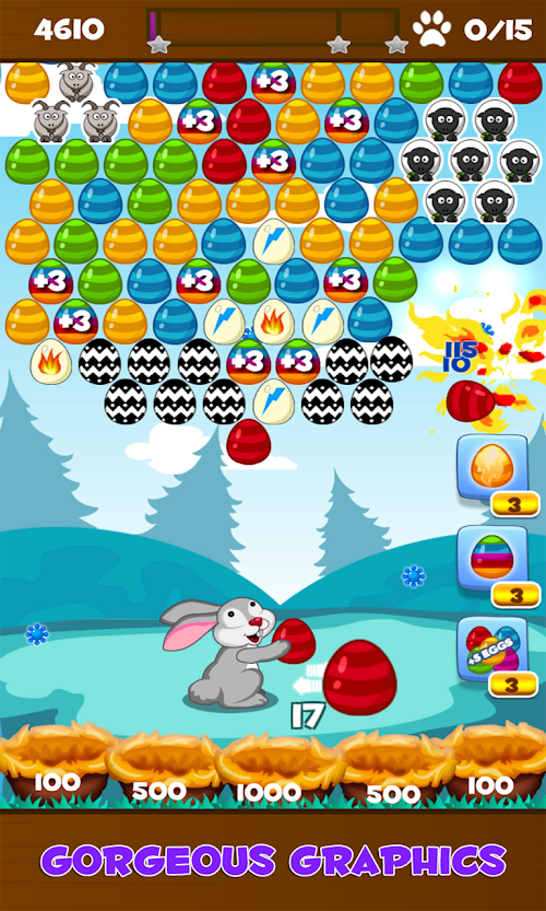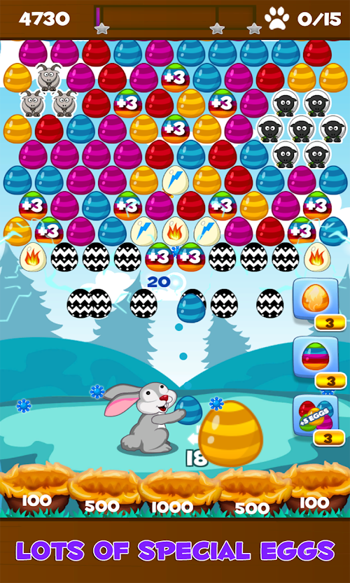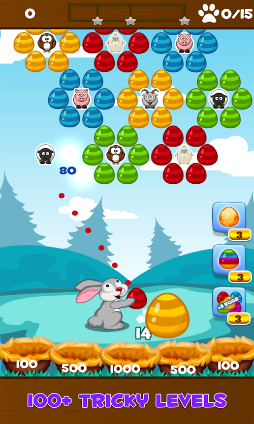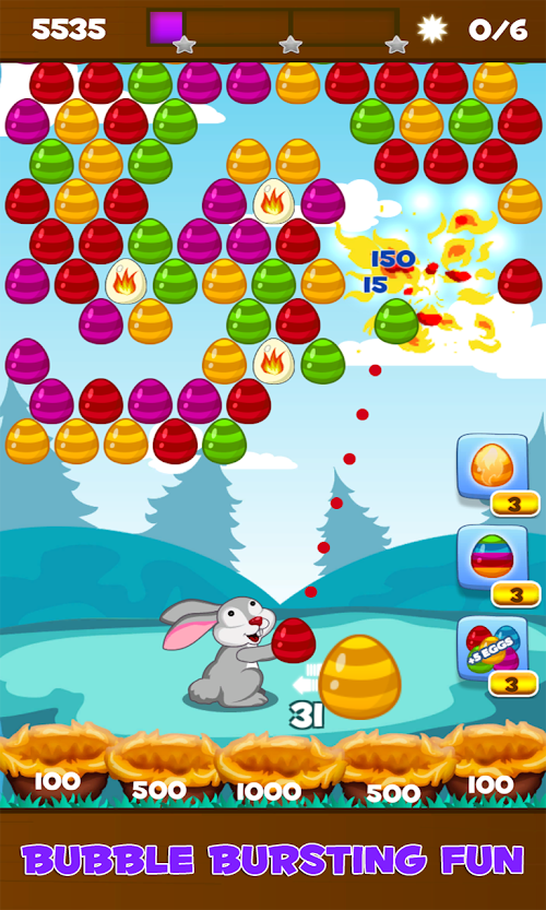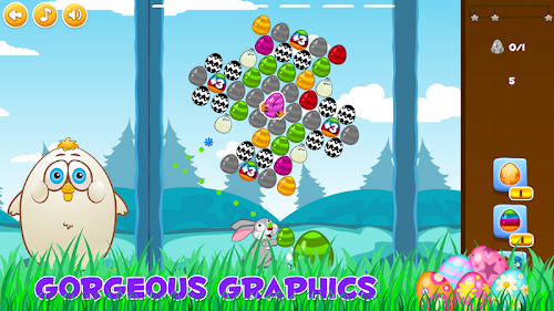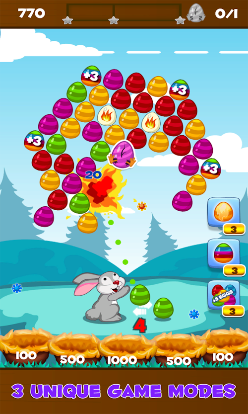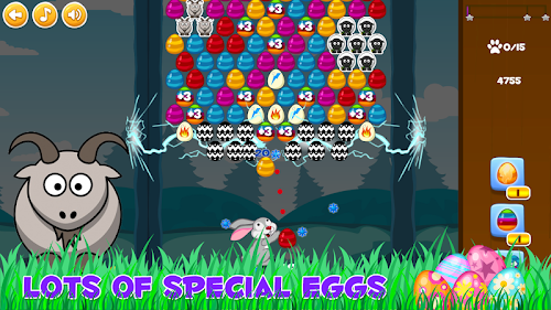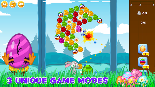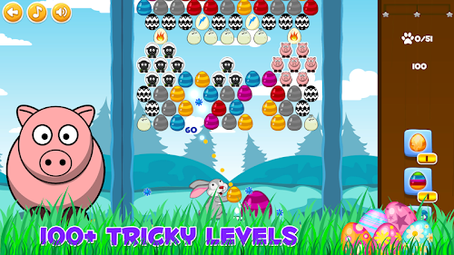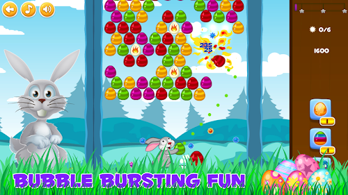 Aim and shoot eggs with the Easter Bunny. Match three or more eggs of the same color to pop the group. The goal of the game is to get the highest possible score and collect all stars on each level with limited number of eggs. There are powerful bonus eggs like fiery or lightning egg that make the gameplay more fun. Chain your hits to get combos and summon ladybugs that help you get even more score by bouncing the falling eggs that will land on the grass in 1 of the 5 nests. Play 3 unique game modes: Clear the top, Free the chicken and Save the animals. Bubble Bunny Blitz is a great casual puzzle game for all ages that features 100+ challenging levels with hours of entertainment.