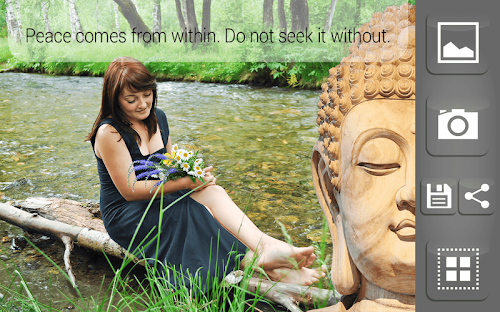 Therefore, it's time to experiment with your photos! This religious image editing software will give you a chance to put your favorite selfie pics and family photographs into fantastic Zen picture frames with Buddha quotes and pictures of Zen garden. Set your edited pics as a wallpaper background and cover your phone with peace and tranquility.