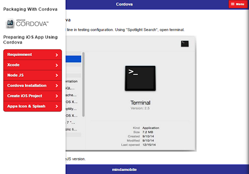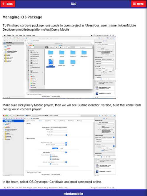 In this app, easy method of content development using jquerymobile starting from initial setup till to be an interactive app interface. Then explained how to install some software required to run Apache Cordova and generate iOS package. The resulting package then will be run using Xcode.