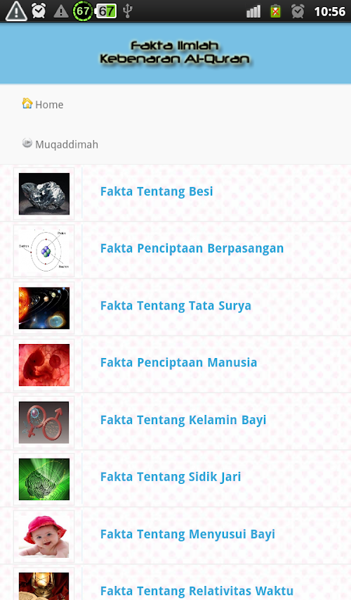 Nah, diaplikasi ini, dapat ditemukan banyak fakta kebenaran Al-Quran yang ada di langit dan bumi serta alam semesta secara keseluruhan yang telah dibuktikan oleh para peneliti dengan penelitian dan teknologi yang baru ada di abad ke-20an. Subhanallah..