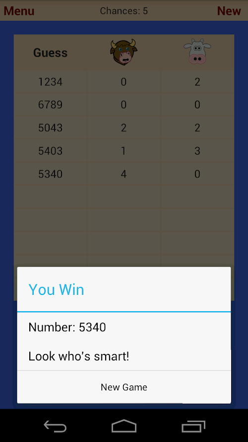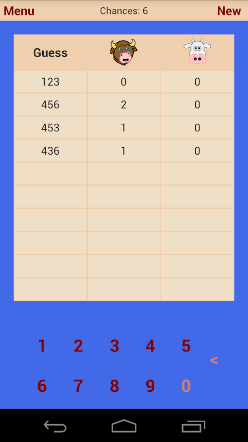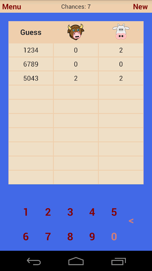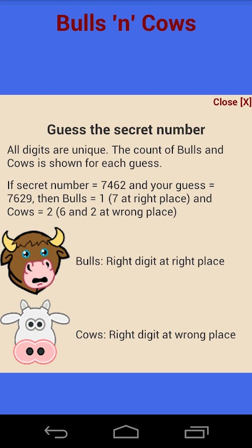 If the secret number = 7462 and the guessed number = 7629, then Bulls = 1 (7 at right place) and Cows = 2 (6 and 2 at wrong place). The player makes the next guess using the number of Bulls and Cows as cues and tries to unlock the secret number within TEN chances. It's a fun way to churn your brain so go ahead and unlock as many secret numbers as you can.