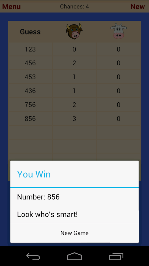 A 100% Ad free experience with extra chances to unlock the secret number. The player has two levels to choose from, a 3-digit and a 4-digit level and for each level a corresponding secret number is generated which contains all unique digits. The count of Bulls and Cows is shown for each guess the player makes. Bulls represent the number of right digits at right place and cows represent the number of right digits at the wrong place.