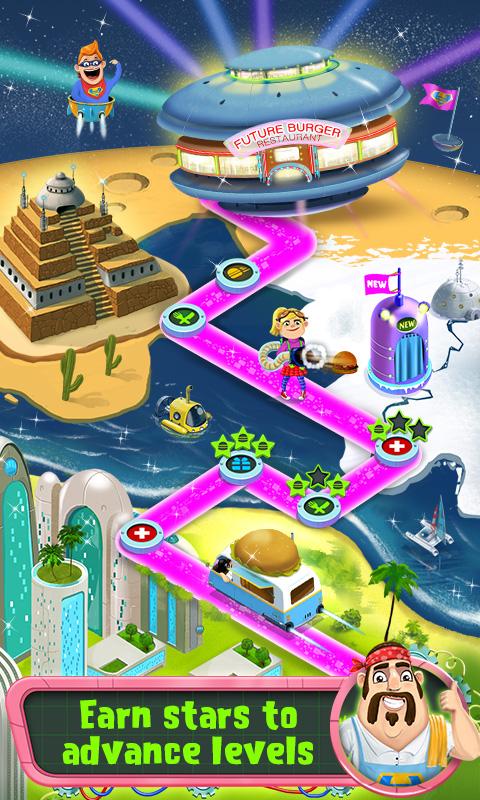 Are you ready to open the first burger restaurant in Space? Grab your apron and chef’s hat and let’s get going! Complete 20 levels on this epic adventure, as you earn burger stars to advance levels. Challenge customers to crazy eating and tossing contests and experience the Master Burger Challenge!