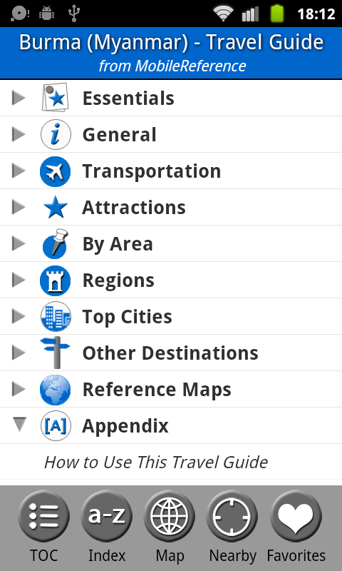 MobileReference Travel Guides provide detailed, practical information about attractions, landmarks, transportation, cultural venues, dining, lodging, history and much more. They are indexed alphabetically and by category, making it easier to access individual articles. Attractions can be viewed on an offline GPS map along with your current location so that you can easily find attractions near you as you explore the city.