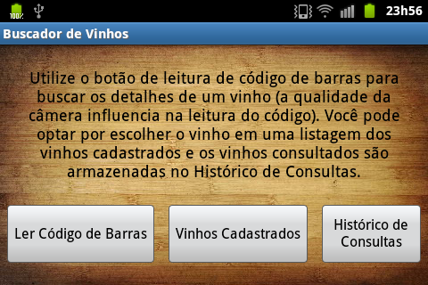 Aplicativo utilizado para encontrar a descrição de um vinho através do seu código de barras ou através de uma listagem que exibe todos os vinhos cadastrados no aplicativo.