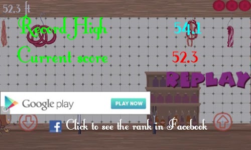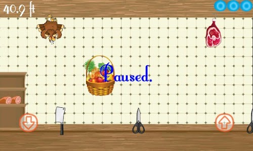 A bird is trying to escape a butcher shop. Help him to go through as far as possible. Go up and down to dodge things. Taking fruits in the middle helps you to gain back the energy.