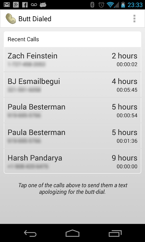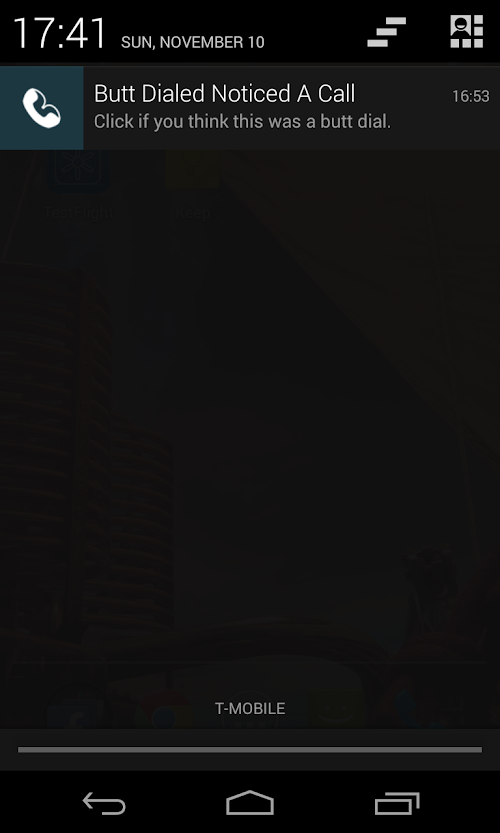 * When you finish a call, Butt Dialed will notify you - if you don't remember making the call you can apologize straight from the notification panel.