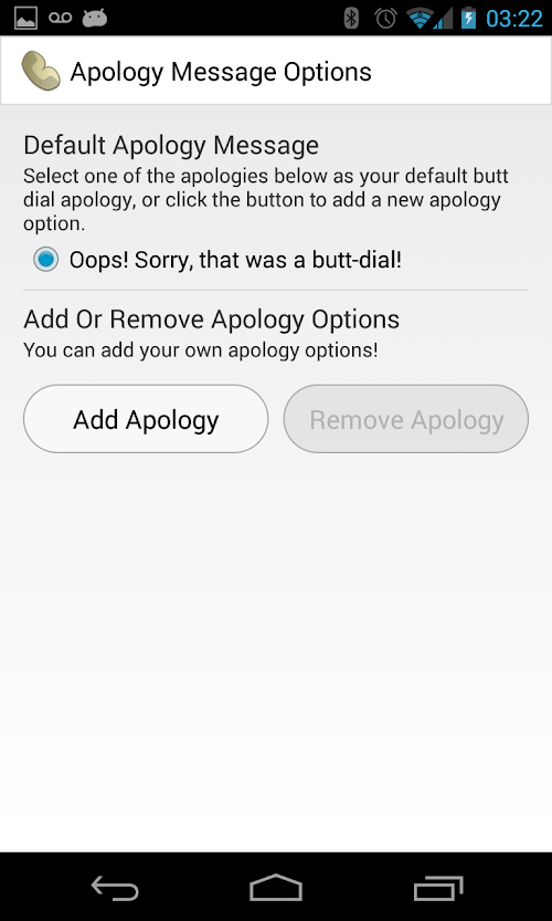 "Butt Dialed" is here to provide an easy way to send the person you called a quick message apologizing for the call.