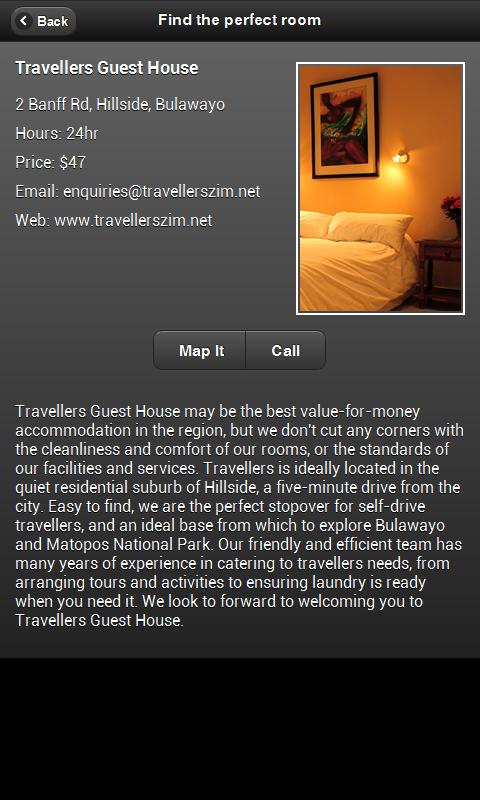 This app also allows users to search for restaurants, accommodation in and around the city of Bulawayo including Matopos and also includes a photo gallery. The app also features up-to-date information on event listings