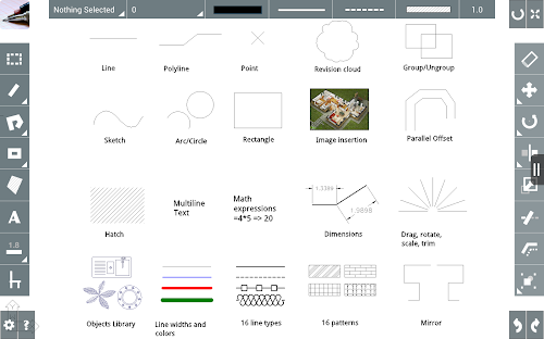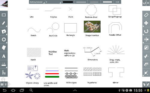 CAD Touch supports every DWG (up to AutoCAD™ 2013) entities for viewing and editing as it uses industry-proof input/output DWG importers, and you can draw new lines, polylines, rectangles, circles, arcs, points (also by xyz coords), hatches, texts, smart/angular dimensions, sketches, revision clouds, raster image, ruler, move, rotate, scale, trim, delete, mirror, offset, group, explode, grips, OSNAP, line/patterns type, alignments guides, objects library, preloaded library with 20+ blocks, customizable library, info tool to query length/perimeter/area, layers, black or white background and many more features.
