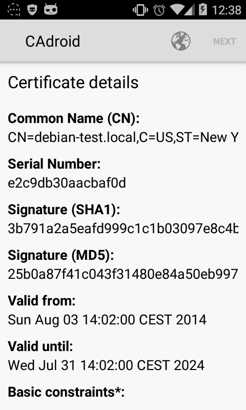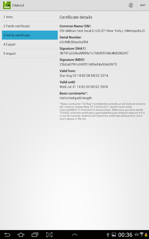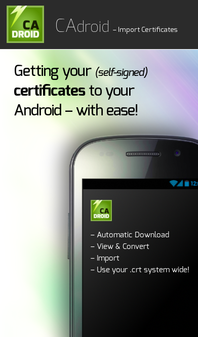 Importing a self-signed certificate to your Android device to ensure secure connections can be a pain when you need to do it manually. CAdroid greatly simplifies this workflow: Type your server address, fetch and view your certificate and then let CAdroid export it to the correct format that Android needs. CAdroid saves it to your root folder. After that you can simply import the certificate to Androids trusted credential storage.