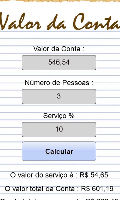 Aplicativo simples mas útil que calcula a conta do restaurante Simple but useful application that calculates the restaurant bill