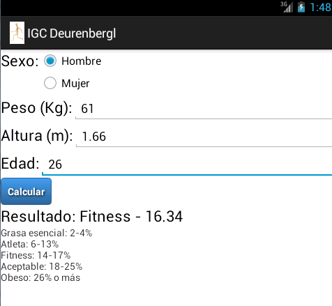 •IGC (Deurenbergl): Calcula tu índice de grasa corporal por la fórmula de Deurenbergl, éste se genera en base al sexo, peso, altura y edad.