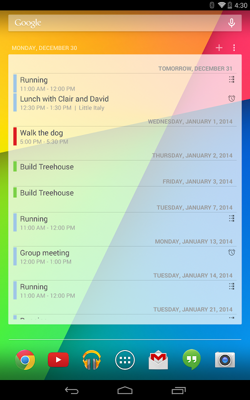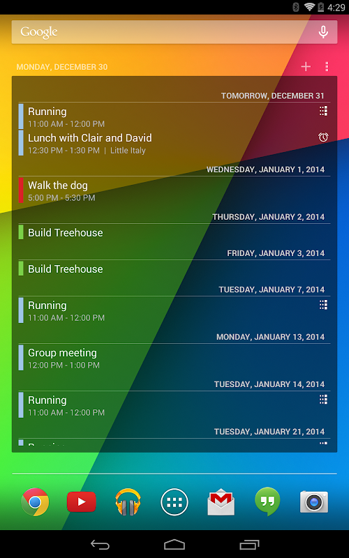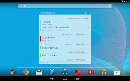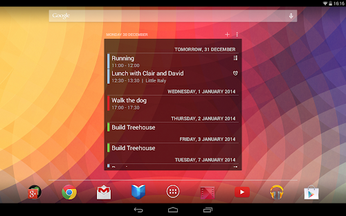 The Android calendar widget is home screen widget for your Android device. It displays a list of upcoming calendar events so that you can easily have a glimpse at your upcoming appointments. Tap on an entry to jump right into your calendar.