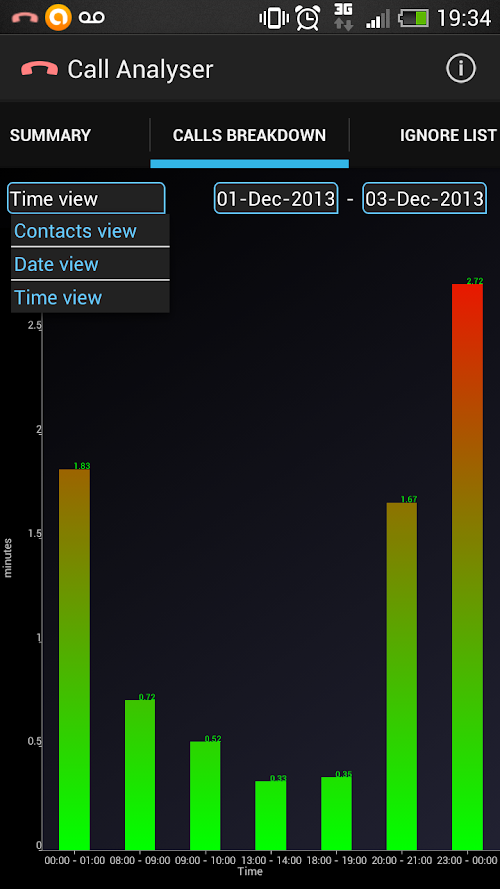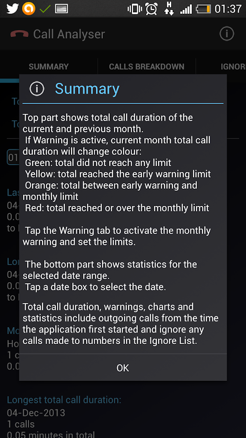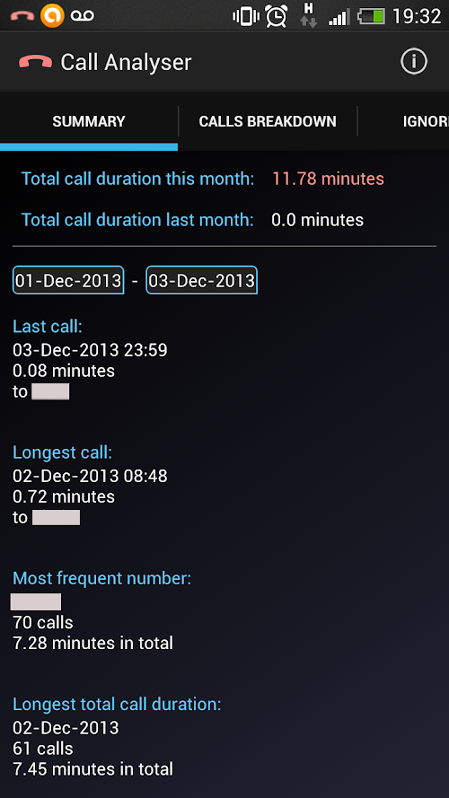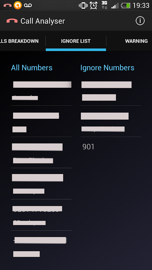 There is also an ignore list where selected numbers can be added to, so the application will ignore them when calculating the total call duration.