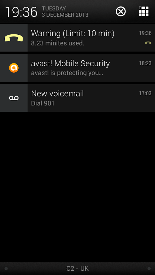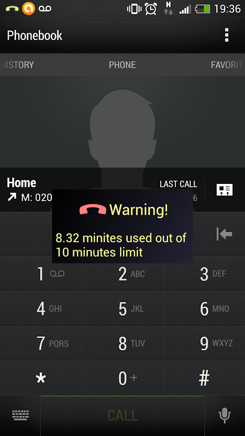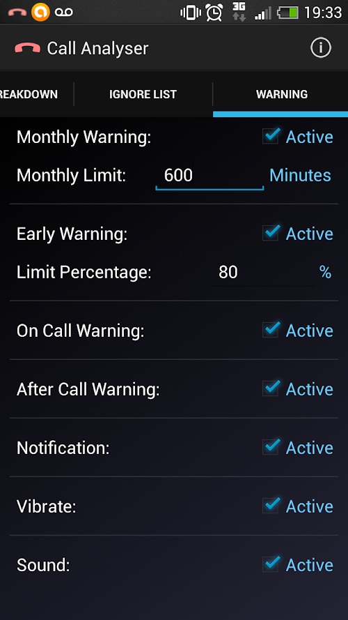 A warning can be set for a specific limit of monthly minutes. The warning can be shown when starting and/or finishing a call as well as notification, sound and vibration. All settings are configurable.