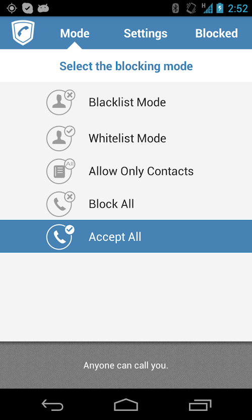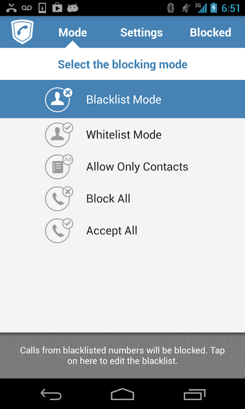 1. Blacklist mode – blocks all numbers in you blacklist. Numbers can be added to the blacklist from contacts, call history, or manually entered.