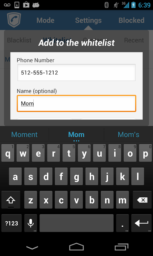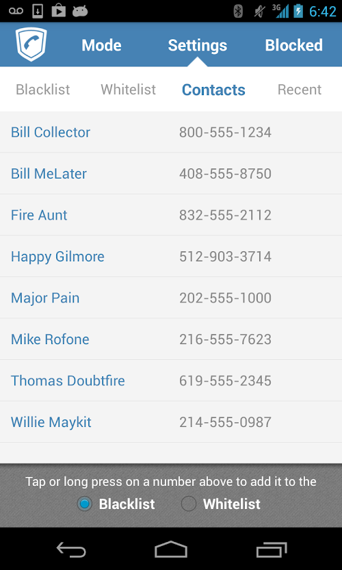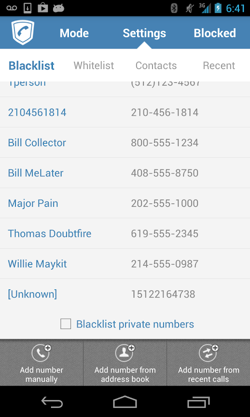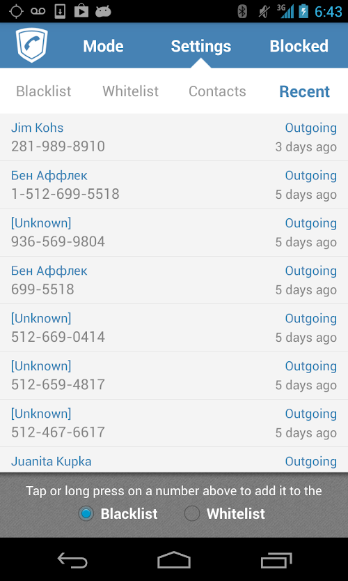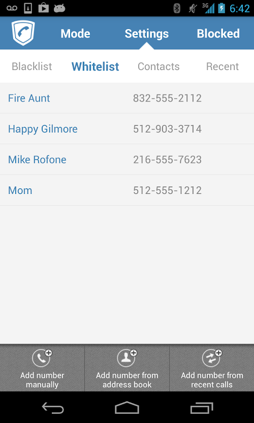 2. Whitelist mode – blocks all numbers not in your white list. Numbers can be added to the whitelist from contacts, call history, or manually entered.