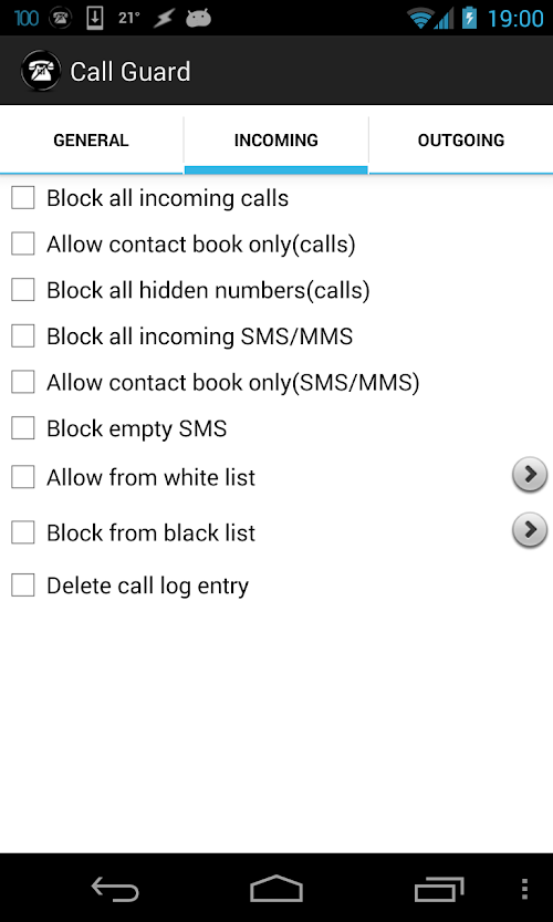 ✔ Block all incoming SMS/MMS, block unknown numbers or add a white or black list (Android 4.3 and below)
