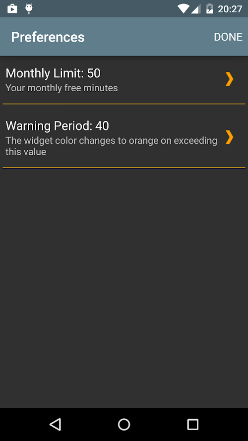 In addition the app includes a home screen widget showing the overall outgoing call duration for the current month. The widget changes color in case the duration exceeds the limitations you defined allowing you to keep an eye on your free minutes.