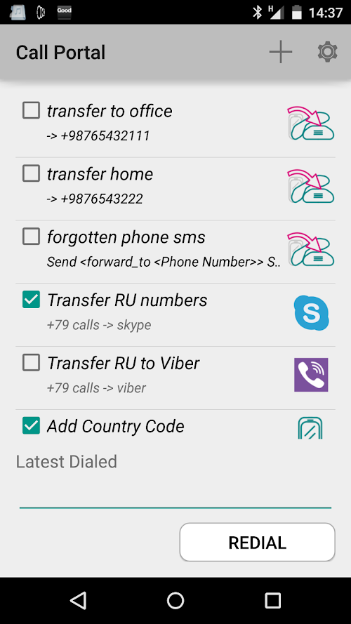* One click transfer of outgoing calls to skype or viber. Option to transfer calls with only specific country code. All that without changing numbers in your phone book.