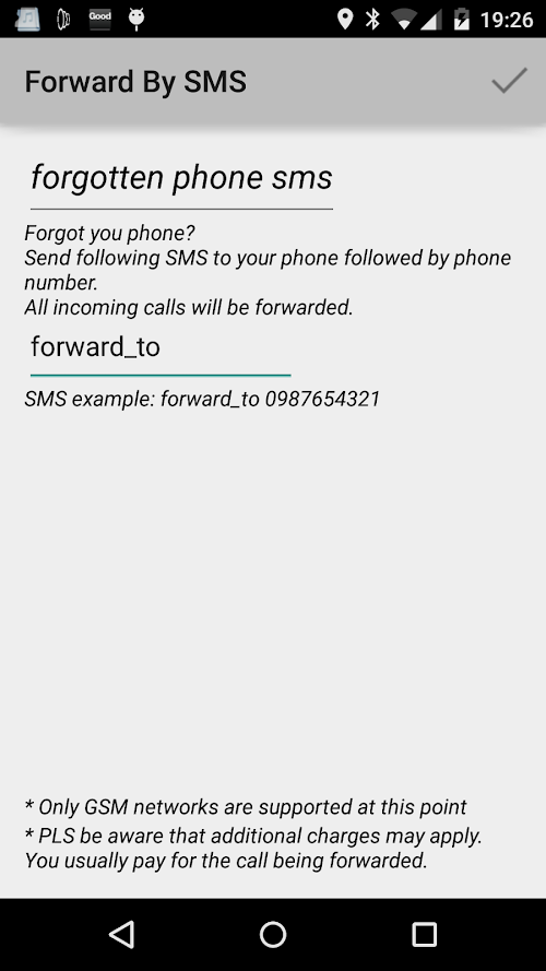 * Enable calls forwarding remotely by sending SMS to your phone. Forgotten phone option.