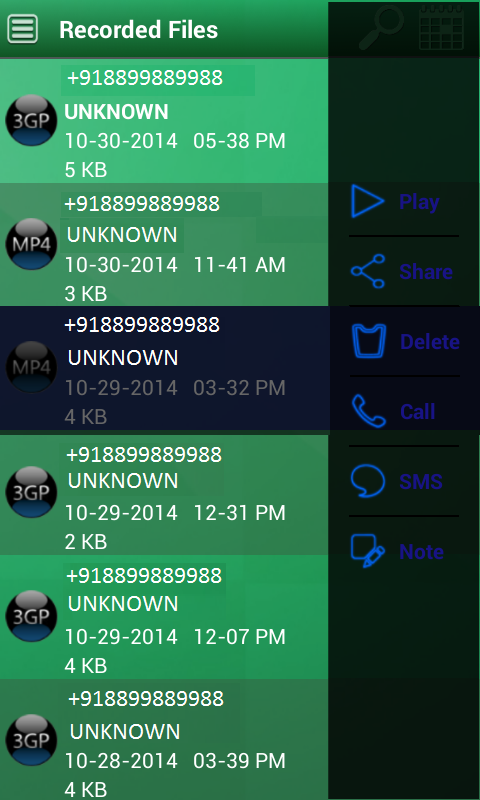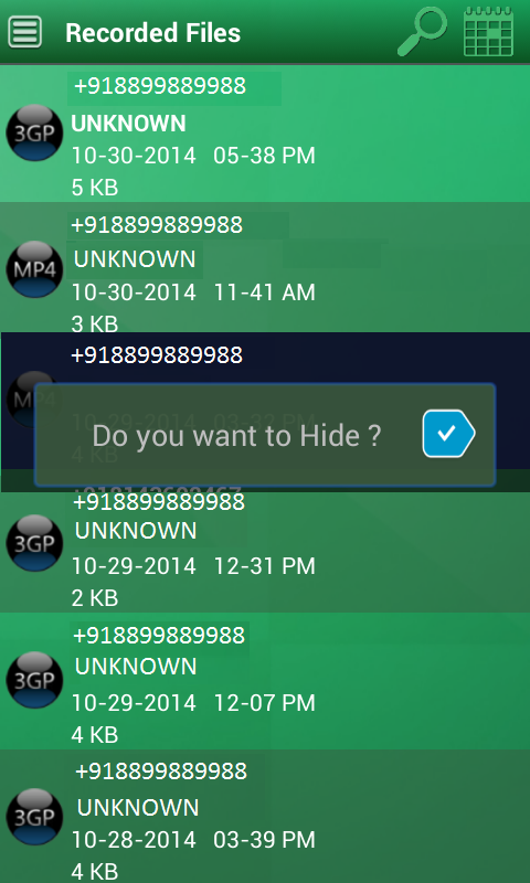 One more good feature is, the important records can be hidden. To hide a record, go to records list, long press on any record. A popup appears that asks for confirmation for hiding the same. To view the hidden records, just tap four times on the Call Recorder text (top left corner) (available in Pro version only).
