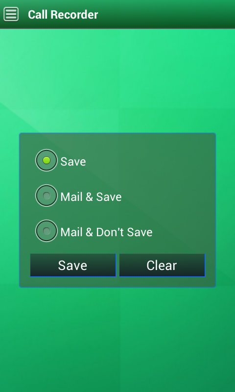 One important feature of our App is as and when the call is over, the recorded file is sent automatically to the pre- configured Gmail account. The records can be saved and sent to the email in three different modes in Mail Settings: 1. Save, 2. Mail and Save, 3. Mail and Don't Save. Default option is Save.