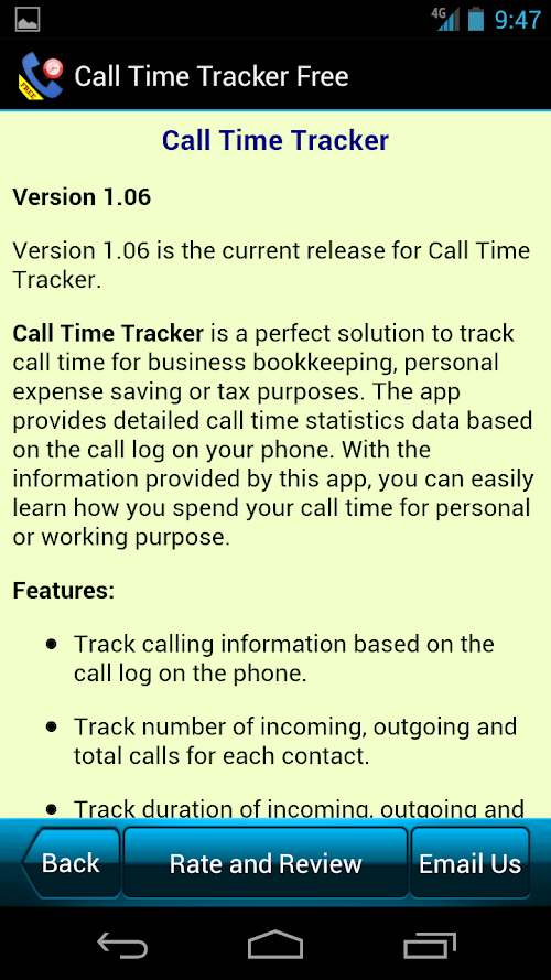 The app provides detailed call time statistics data based on the call log on your phone. With the information provided by this app, you can easily learn how you spend your call time for personal or working purpose.