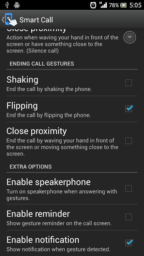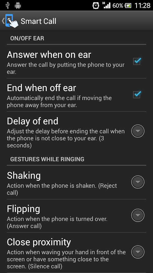 * Options for silencing/answering/ending/rejecting the call by using these gestures: shaking the phone; flipping the phone(turn the phone over); close proximity(waving your hand in front of the screen or have something close to the screen).