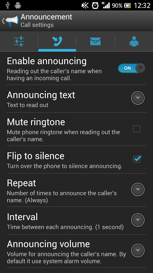 ★ Announcement: use Text-to-speech engine to read out information when having incoming calls or new SMS messages