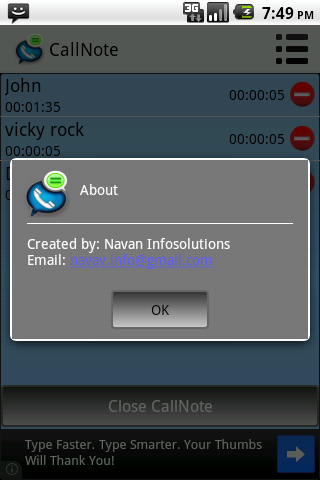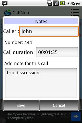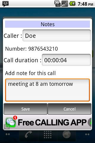 This application allows you to add and edit call notes, after disconnecting the call, call note popup will appear having pre-filled call information (caller name, duration, etc.) and user can add, save and share the call summary or key points. Later this information will be available to user so that user can recall the conversation after seeing the call note: